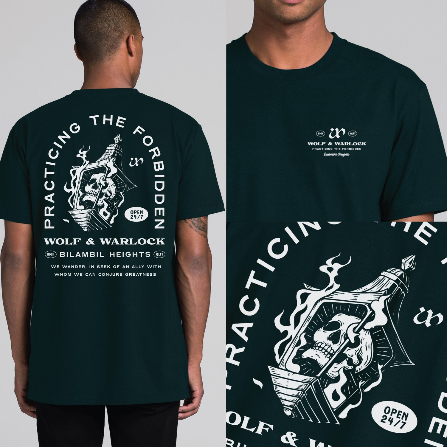 Custom Illustration screen printed onto an AS Colour Pine Green T-Shirt